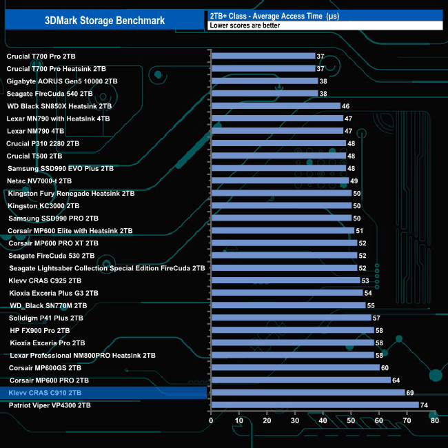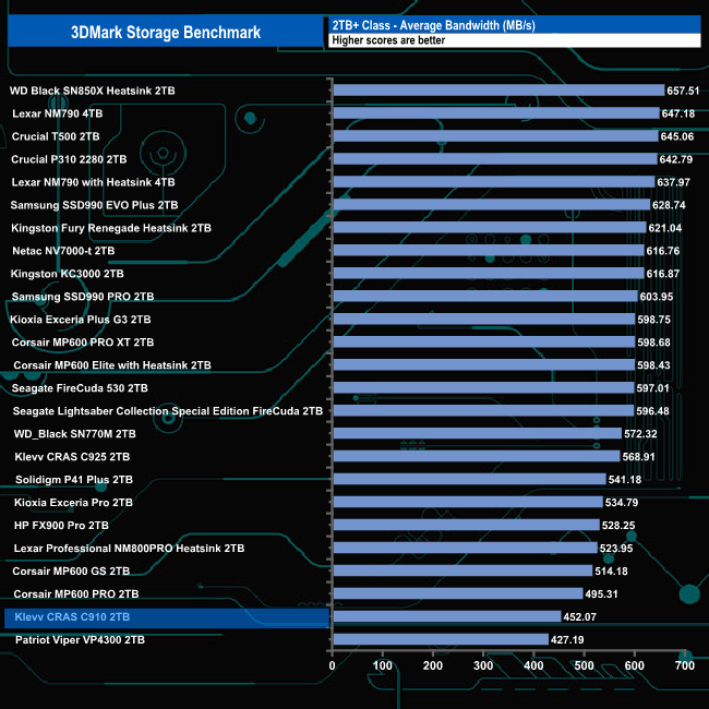 The Klevv CRAS C910 Plus test result of 654.86MB/s sees it in the penultimate spot on the results chart just above Patriot's Viper VP4300.