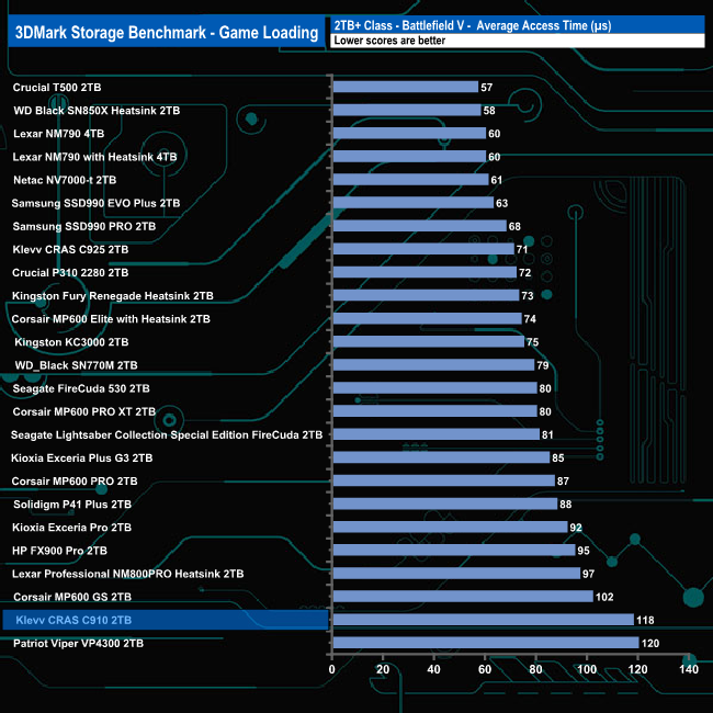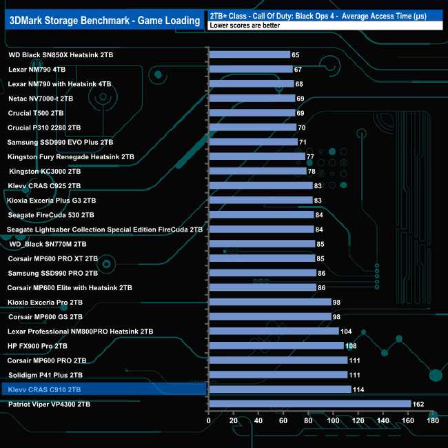 The drive handled the Call Of Duty: Black Ops 4 test a little better than the Battlefield V one as it moves up a place to site above the Patriot Viper VP4300 and the HP FX900 Pro although its average access time was higher than the HP drive.
