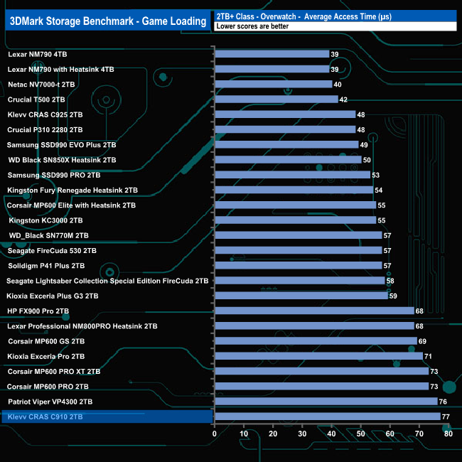 The Overwatch game loading test finds the drive in the same spot on the table as the Battlefield V result.