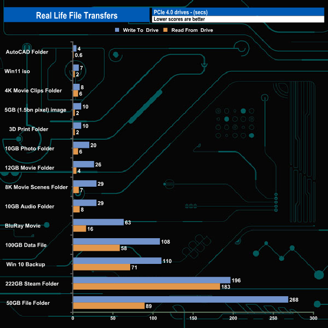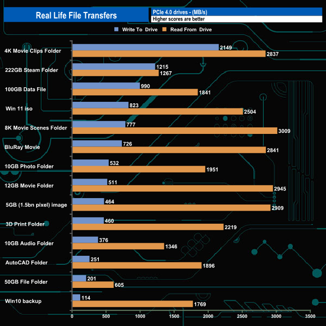 Reading the data back the drive averaged 2,138MB/s with the fastest performance came with the 8K folder transfer at 3,009MB/s (7 secs) with the 50GB file transfer again the slowest, this time at 605MB/s (89 secs).