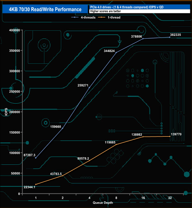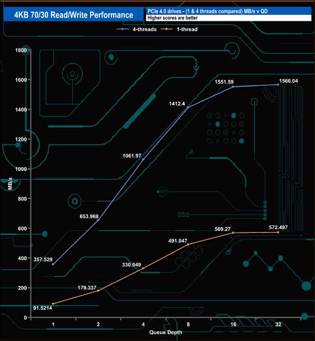 We used CrystalDiskMark 8’s custom settings to test the 4K 70/30 mixed read/write performance of the drive through a range of queue depths using a single thread and four threads.