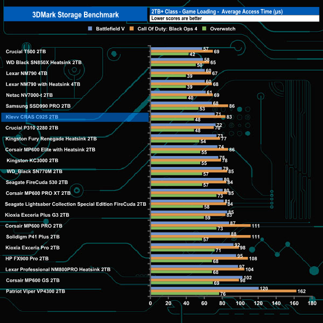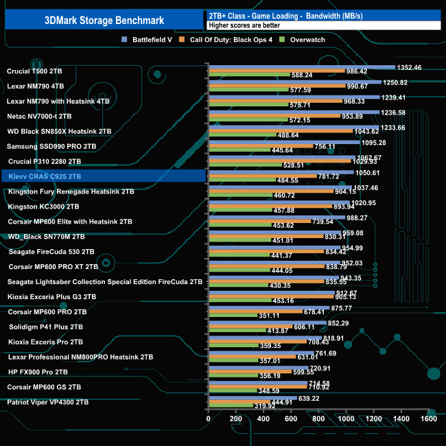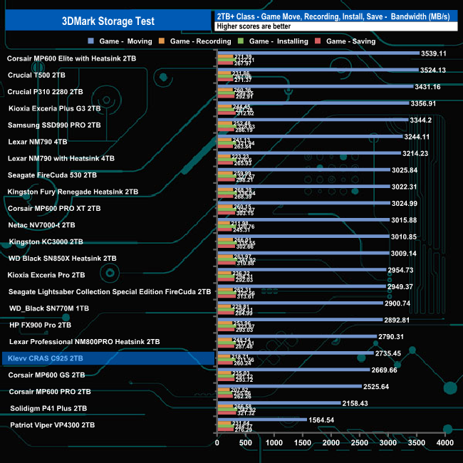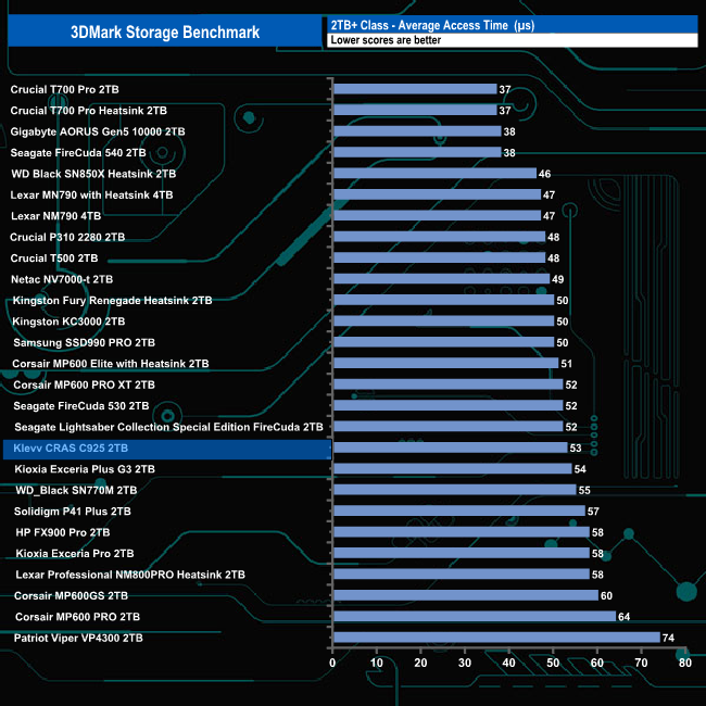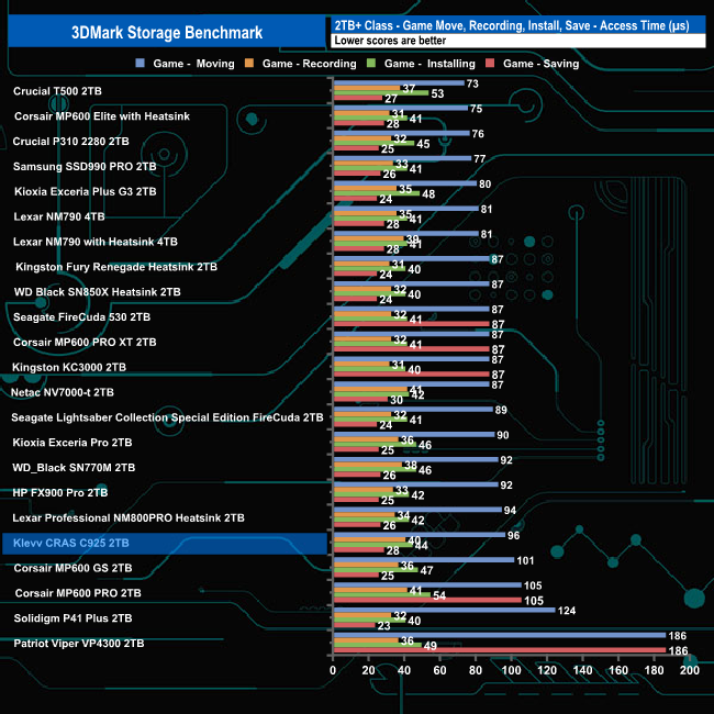In 3DMark’s Storage Test, the 2TB CRAS C925 had an average game loading bandwidth figure for the three games of 772.29MB/s with an average access time figure of 67µs (0.067m/s).