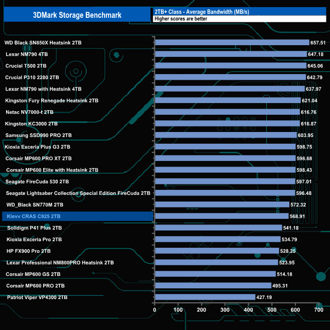 The average bandwidth figure for the 2TB CRAS C925 for the complete benchmark run was 568.91MB/s, a result which sees the drive in the bottom half of the results table.