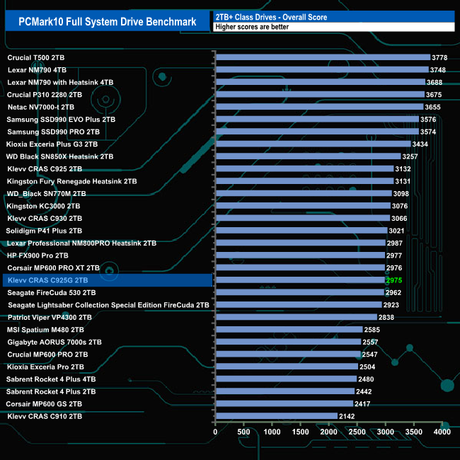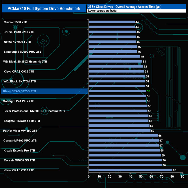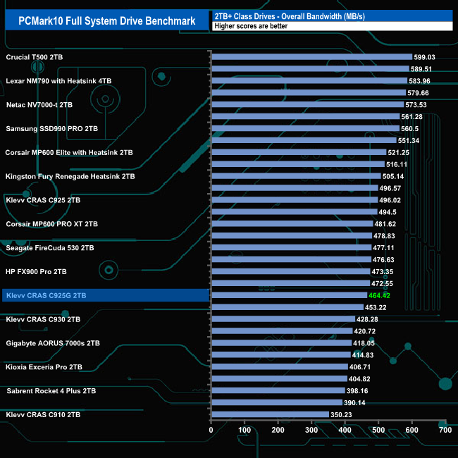 With an overall bandwidth figure of 464.02MB/s, the 2TB Klevv CRAS C925G sits in the lower half of the results table, 31MB/s behind the CRAS C925.