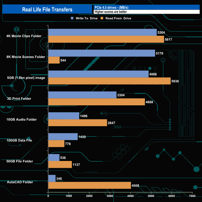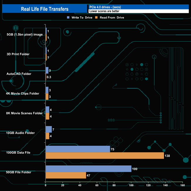 To test the real-life performance of a drive, we use a mix of folder/file types, and by using the FastCopy utility (which gives a time as well as MB/s result), we record the performance of the drive reading from & writing to a 2TB Kingston KC3000.
