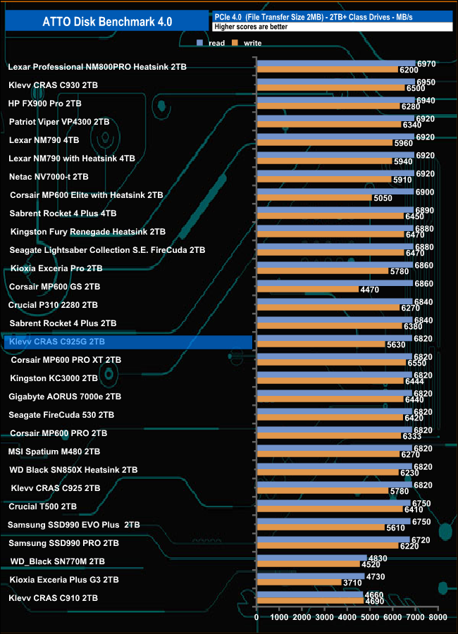 With the ATTO 4 benchmark results, the drive fell short of the official 7,400MB/s and 6,500MB/s for Sequential reads and writes respectively, with reads at 6,820MB/s and writes at 5,630MB/s, results which sees the drive in a mid position in the results chart.