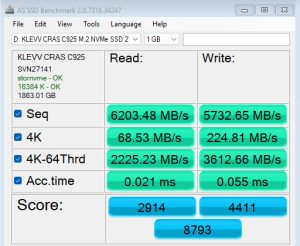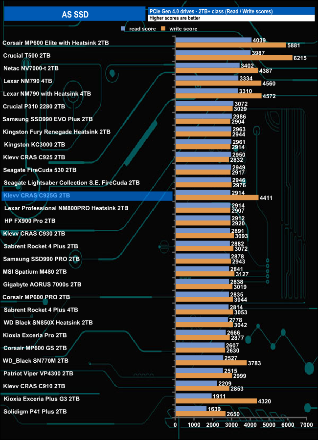 The 2TB CRAS C925G read score of 2914 is good enough to slip the drive into the top mid section of our results chart, but the write score is much stronger.