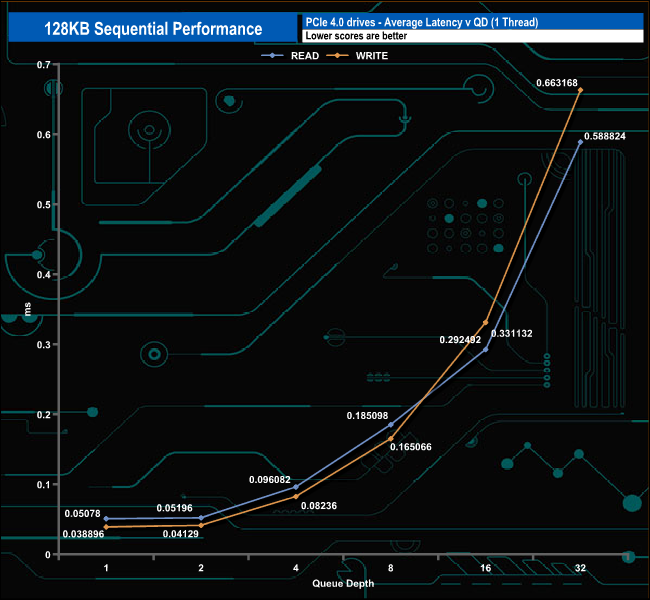 We used CrystalDiskMark 8‘s custom settings to test the Sequential read and write performance of the drive through a range of queue depths. The setup for the tests is listed below.