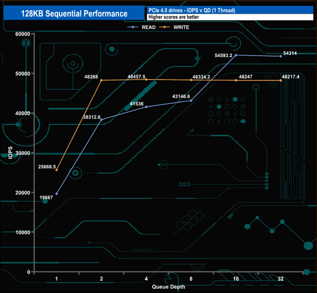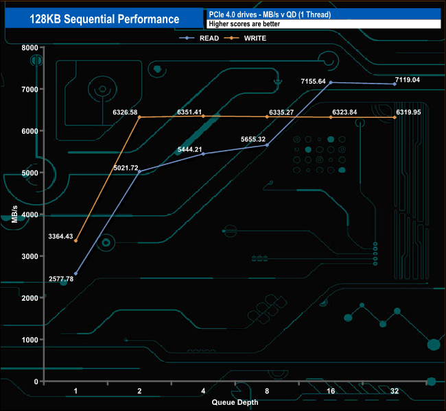 With our 128KB Sequential tests, we came up just short of the maximum figures for the drive in both the read and write tests. The read figure of 7,155MB/s (QD16) is 245MB shy of the official 7,400MB/s, while the writes are just 149MB/s shy of the official 6,500MB/s, with a peak of 6,351MB/s (QD4).