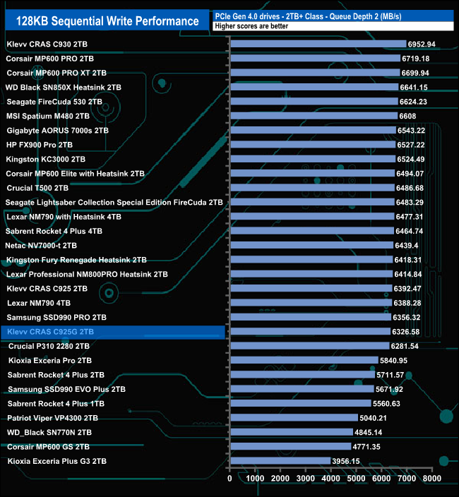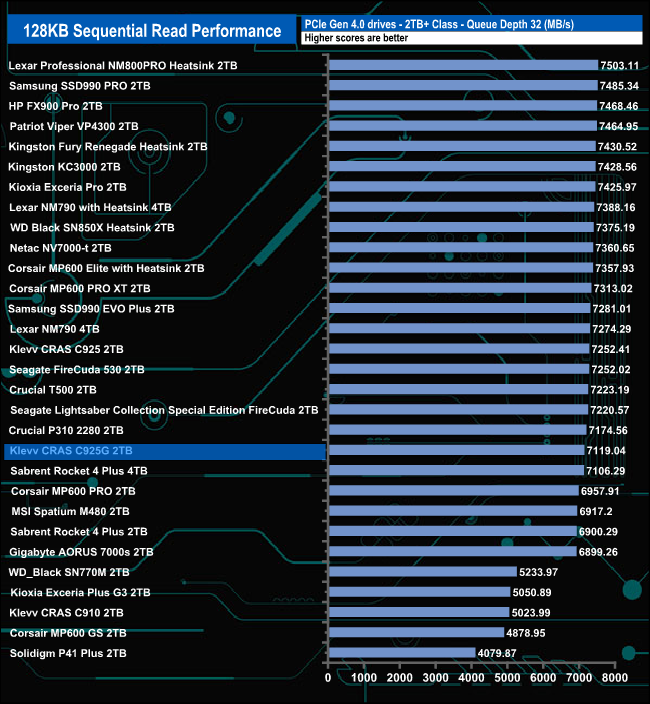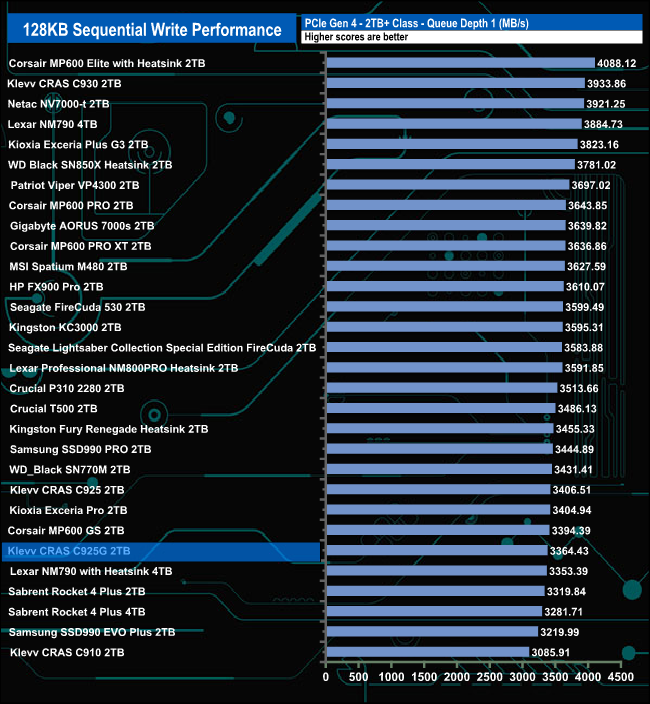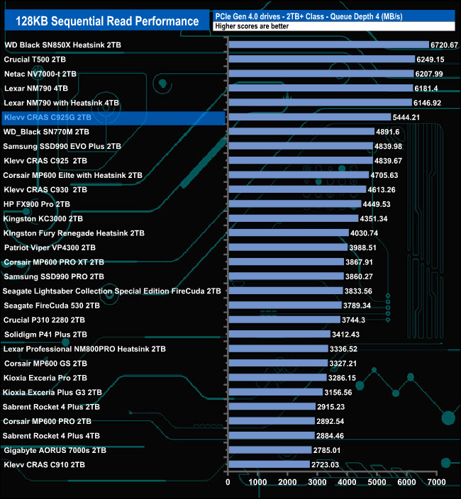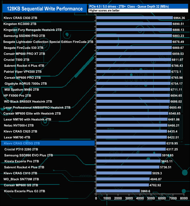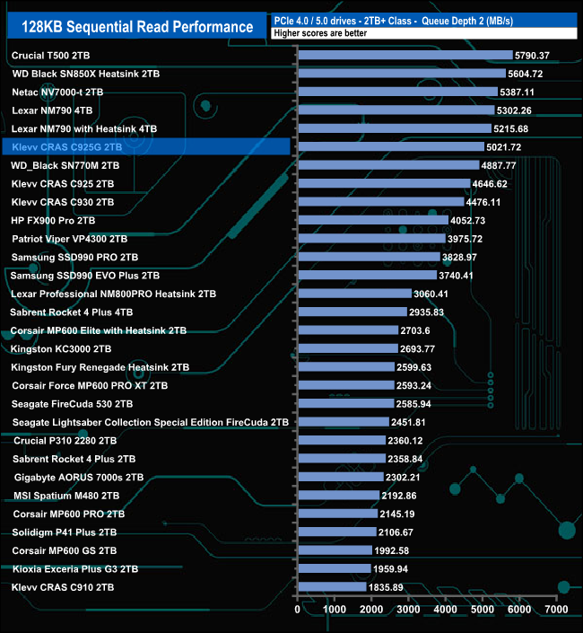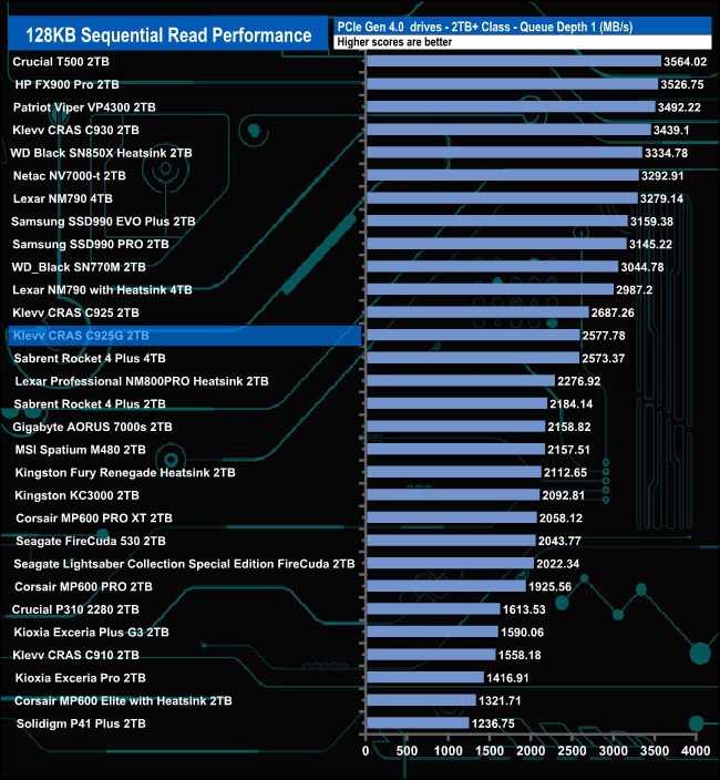 At QD1, the 2TB CRAS C925G sits just outside the top ten of the Sequential read results table. At QDs 2 and 4, it makes progress up the charts, but at QD32 it drops to a lower mid-table position.
