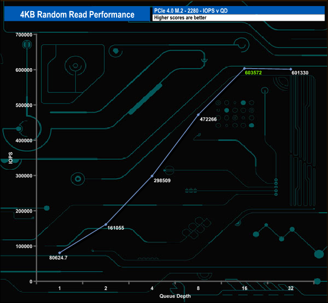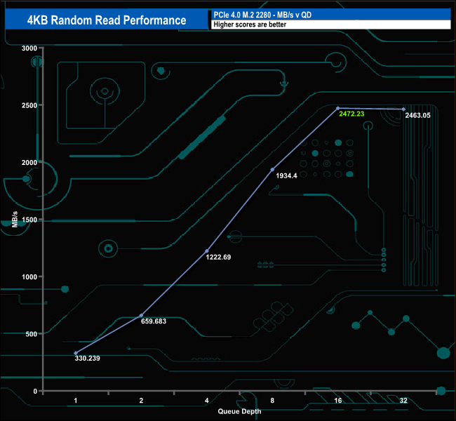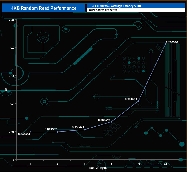 We used CrystalDiskMark 8‘s custom settings to test the 4K random read performance of the drive through a range of queue depths. The setup for the tests is listed below.