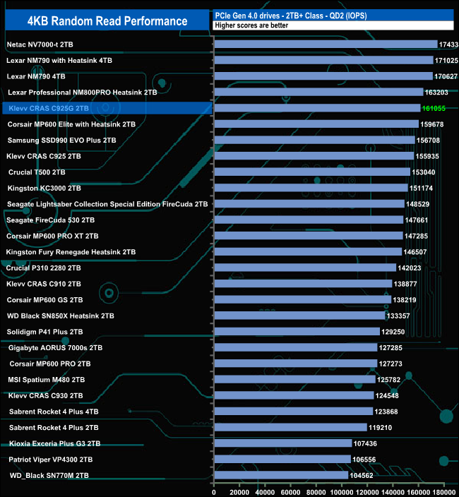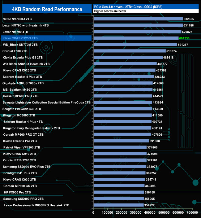 Officially, the 2TB CRAS C925G is rated as up to 700,000 IOPS for 4K random reads. With our four-threaded tests, we couldn't get close to the official maximum figure with a peak test result of 603,572 IOPS at QD16 before the performance dropped back to 601,330 IOPS at the end of the test run (QD32).
