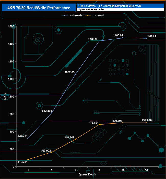 We used CrystalDiskMark 8’s custom settings to test the 4K 70/30 mixed read/write performance of the drive through a range of queue depths using a single thread and four threads.