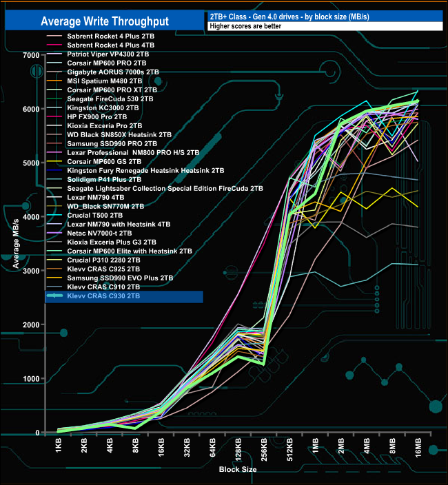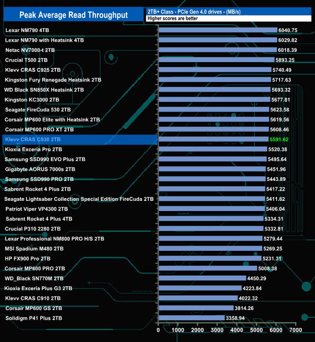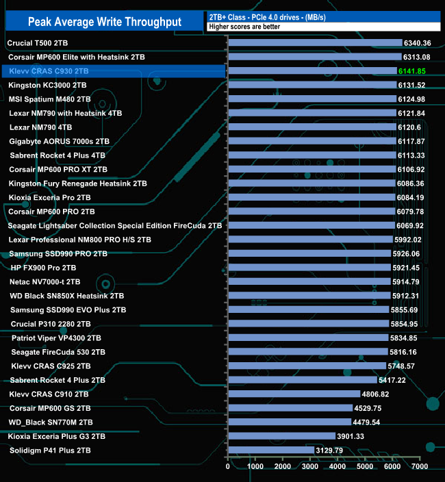 The test result of 6,141MB/s, puts the 2TB CRAS C930 into third place in the results chart.
