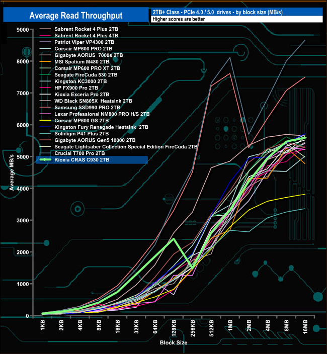 In our read-throughput test, the 2TB CRAS C930 peaked at 5,591.62MB/s at the 16MB block mark, which is 1,809MB/s short of the official maximum of 7,400MB/s.