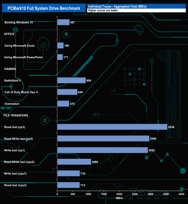 The three gaming traces produced an average result of 641MB/s, the fastest being Battlefield V at 909MB/s. Next came Call of Duty Black Ops 4 at 640MB/s followed by Overwatch at 375MB/s.