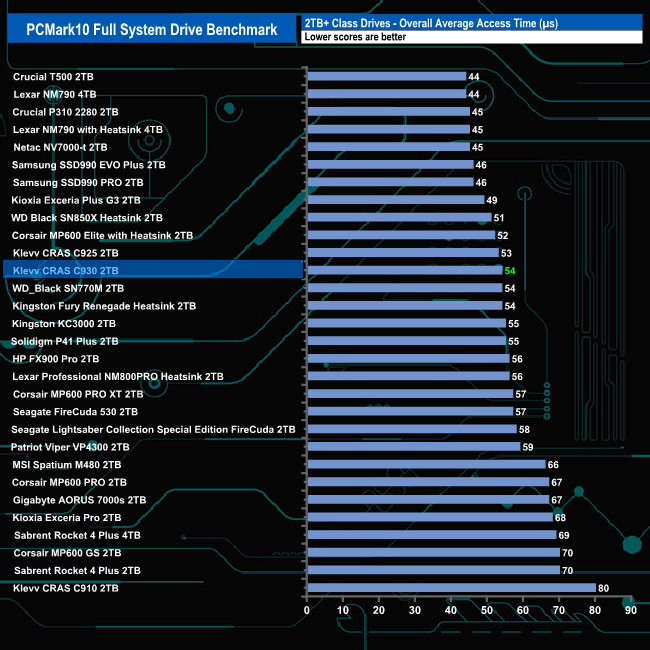 Klevv's 2TB CRAS C930 performs well enough in PCMark10's Full System Drive Benchmark without anything standing out. The six Adobe startup traces produced an average of 250MB/s, with the fastest being the Adobe Premiere Pro startup trace at 309MB/s, with the Lightroom trace the slowest at 210MB/s. For the five usage traces, the fastest was, as usual, the Photoshop heavy usage trace at 1,018MB/s, and including this result, the drive averaged 451MB/s for the five traces.