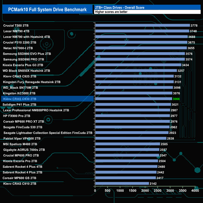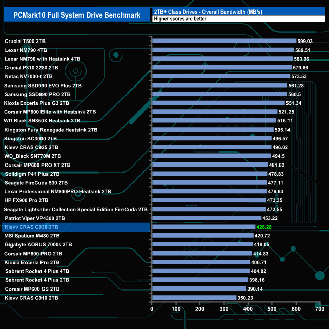 With an overall bandwidth figure of 428.28MB/s, the 2TB Klevv CRAS C930 sits in the lower half of the results table.