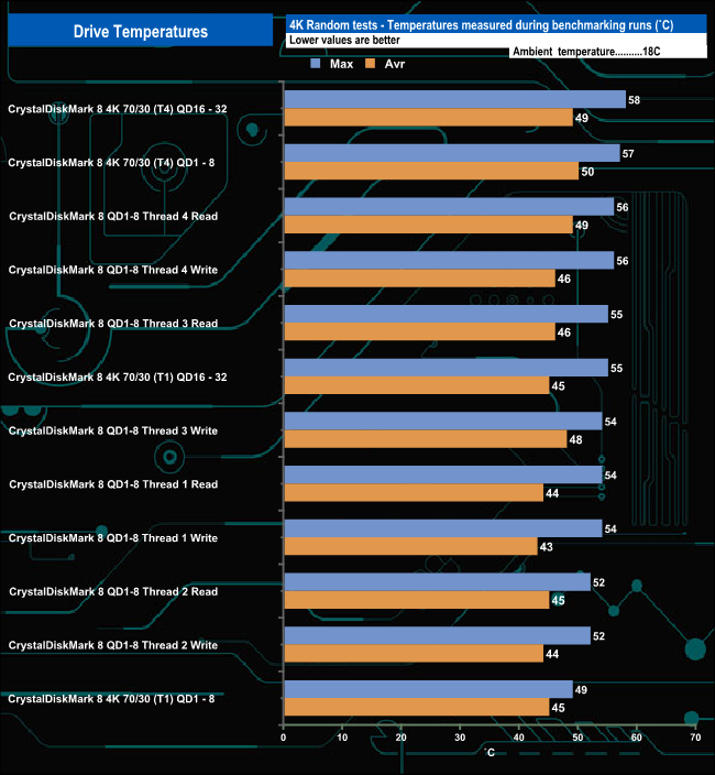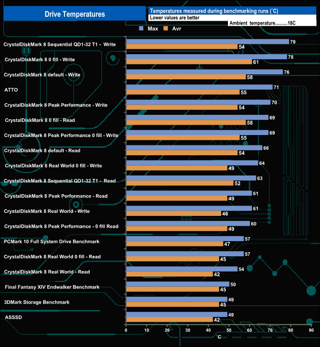 We took note of the drive’s temperature during some of our benchmarking runs. Klevv's CRAS C930 comes with an optional stick-on full-width aluminium heatsink, using this in conjunction with enhanced thermal management (thermal throttling) to keep the drive thermally stable. We did all of our testing with this heatsink in place. The drive got fairly hot during our testing, with the hottest coming during the CrystalDiskMark 8's Sequential Write tests at 79° C, but despite this, we didn't see any thermal throttling occurring. The drive averaged 63° C for the bulk of the testing, with the 4K tests averaging 54° C.