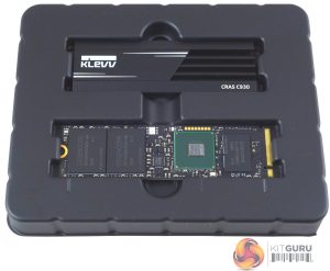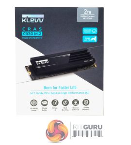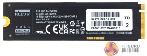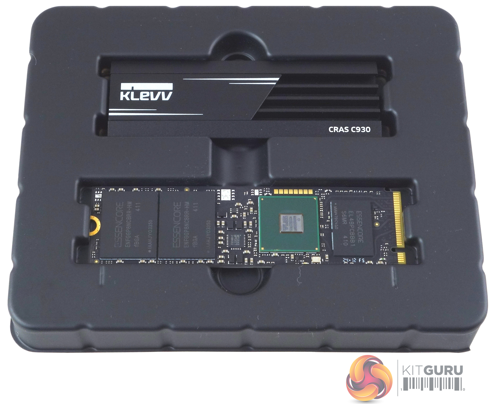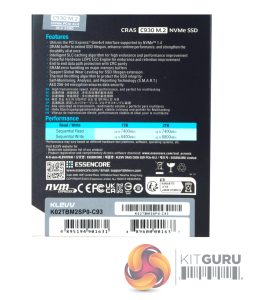The Klevv CRAS C930 ships in a compact box with a clear image of the drive in the centre. Above this image, in the top right-hand corner, is a sticker holding the drive's capacity (2TB). Under this are two icons for the attachable heatsink and PS5 support. Below the drive's image is a row of five icons for 3D NAND, NVMe 1.4, SLC Caching, Backup software, and a limited warranty. The rear of the box has a detailed feature list, under which is a multilingual statement about transmission speed, stable performance, and the drive's capabilities. Under this is a performance table for both C930 drives displaying Sequential read/write speeds.