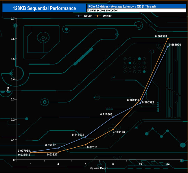 The poorest performance in the Sequential write tests comes at QD1, where the drive sits in second place in the table. At QDs 2, 4 and 32, the drive is the fastest Gen 4 drive we've seen to date for these tests.