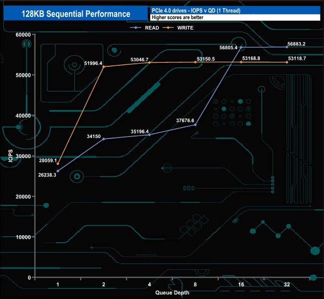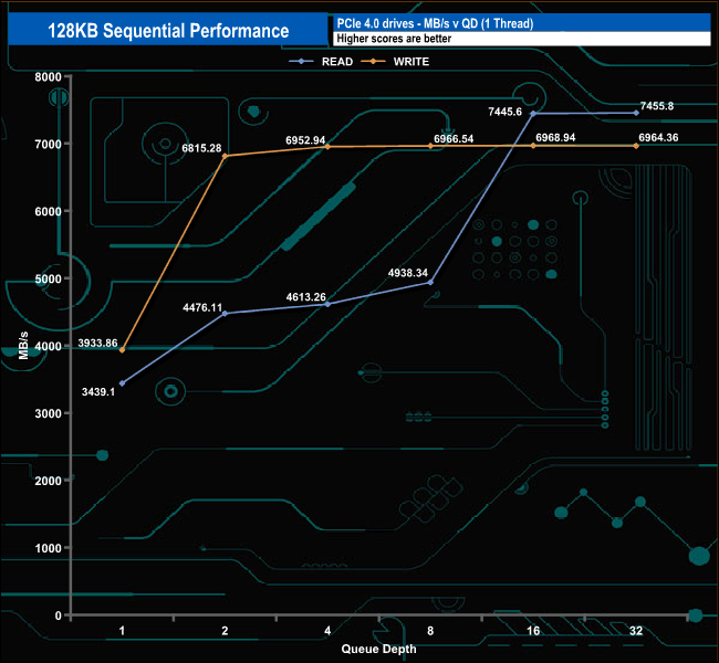 With our 128KB Sequential tests, we could confirm both read and write maximum figures ( 7,400MB/s and 6,800MB/s, respectively). The best read figure we saw was 7,455.8MB/s (QD32), while the peak write figure we saw was 6,968.94MB/s at QD16.