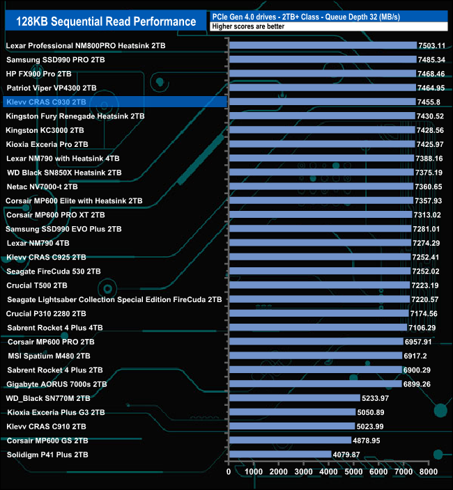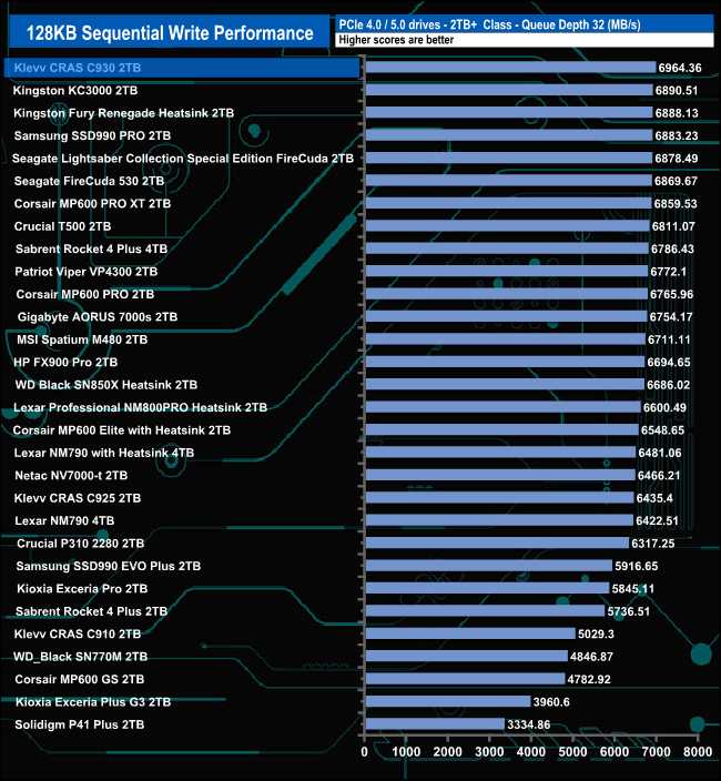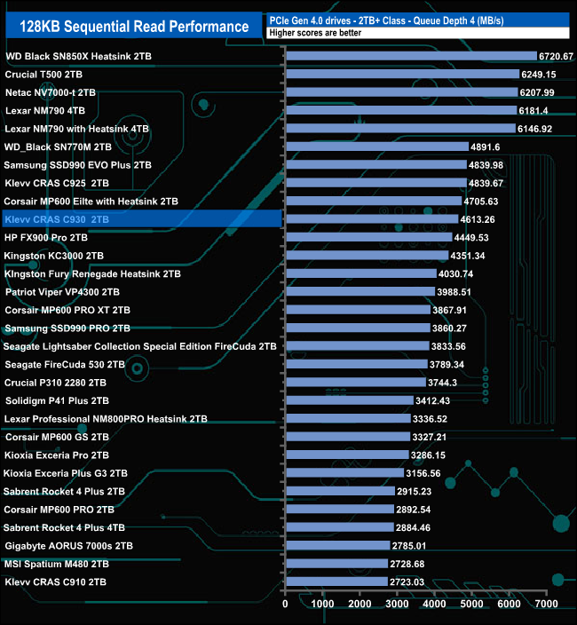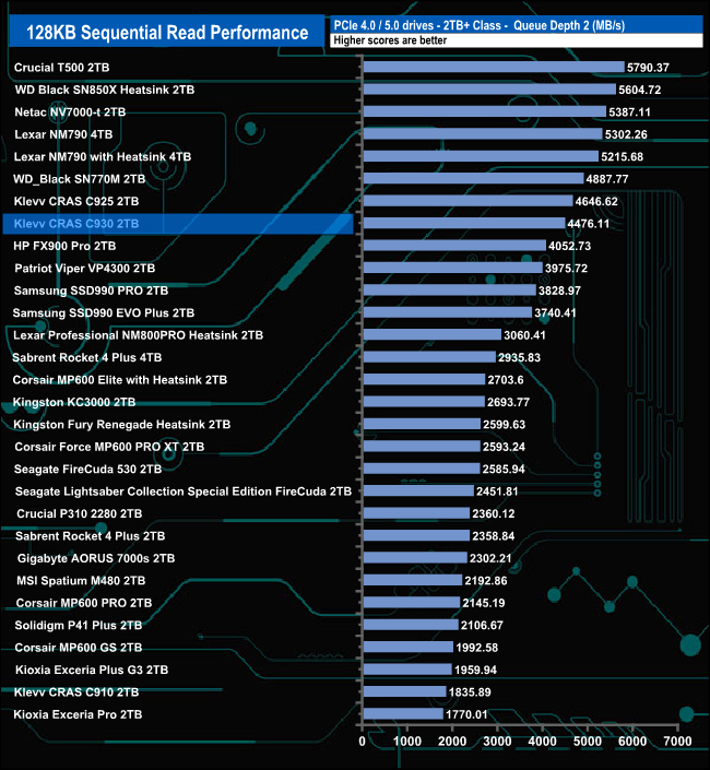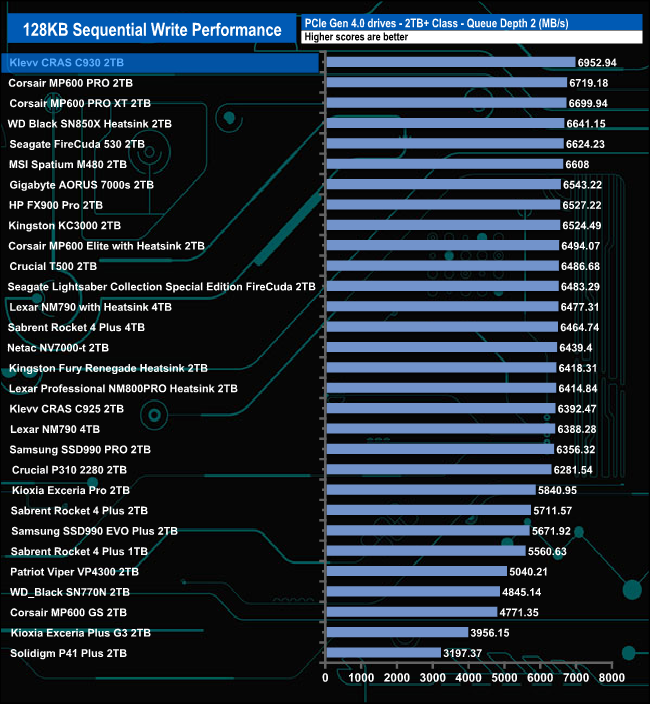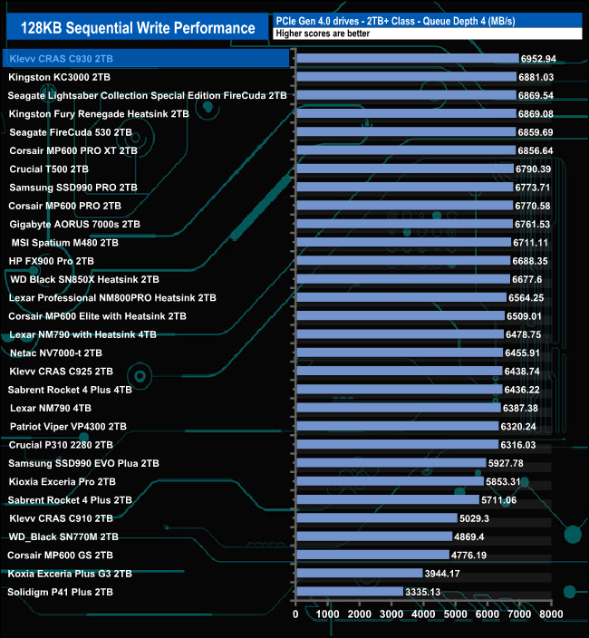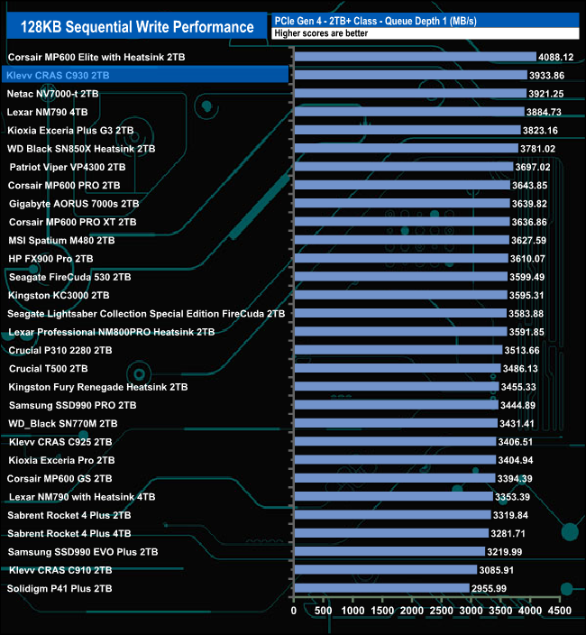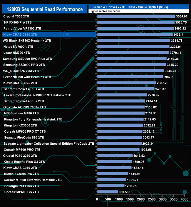 Compared to drives around it, the CRAS 930 performed best at QD1 where its test result of 3,439MB/s puts the drive into fourth place in the results chart. At QD's 2 and 4 the drive drops down the chart before staging a recovery at QD32.