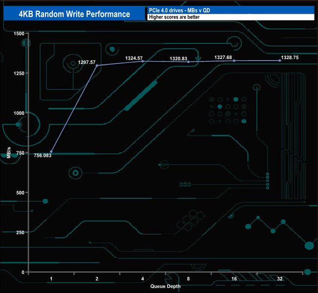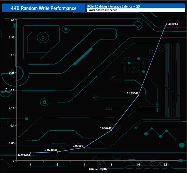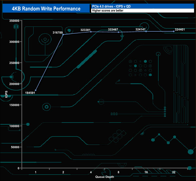 We used CrystalDiskMark 8‘s custom settings to test the 4K random write performance of the drive through a range of queue depths. The setup for the tests is listed below.