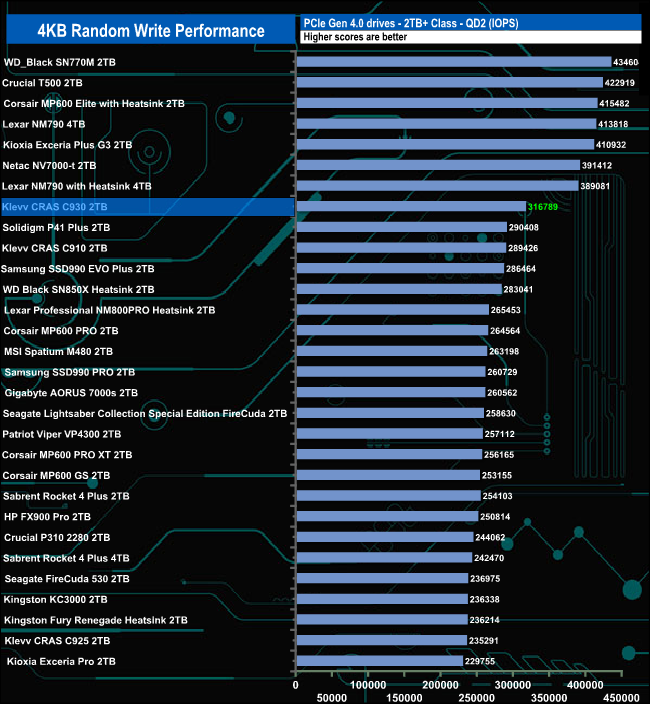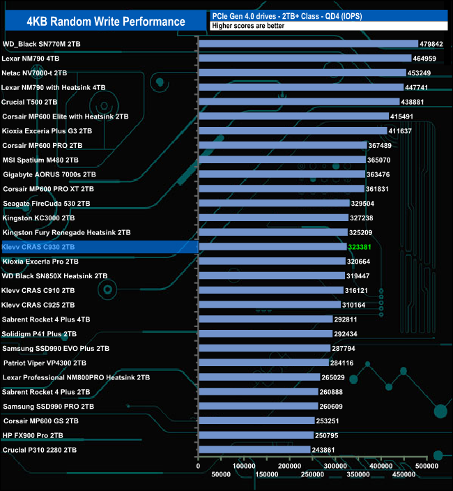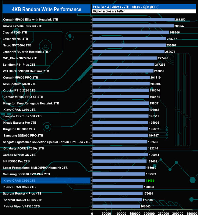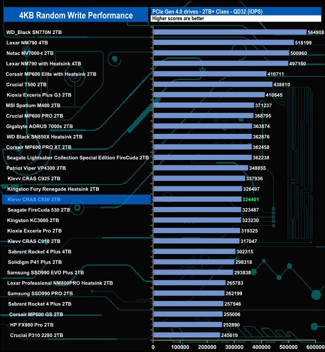 As with the random reads, Klevv rates the 4K random write performance of the 2TB CRAS C930 as up to 1,000K IOPS. With our four-threaded tests, the best we saw from the drive was 324,401 IOPS (1,328.75MB/s) at QD32.
