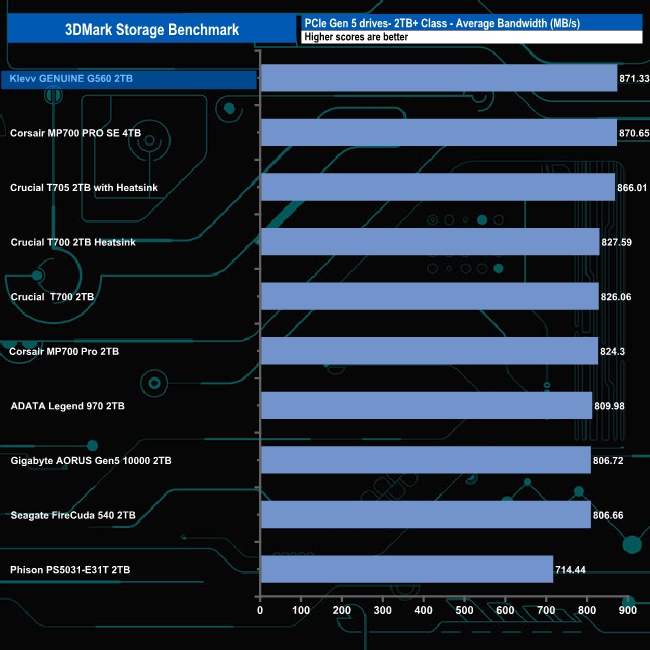 The average bandwidth figure for the 2TB GENUINE G560 for the complete benchmark run was 871.33MB/s, a result which sees the drive just top of the results table by the smallest amount.