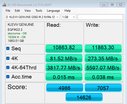 With a read score of 4986, the G560 sits in second place behind Corsair's MP700 PRO SE drive but its write score of 7057 is the fastest we've seen to date for a consumer Gen.5 drive.