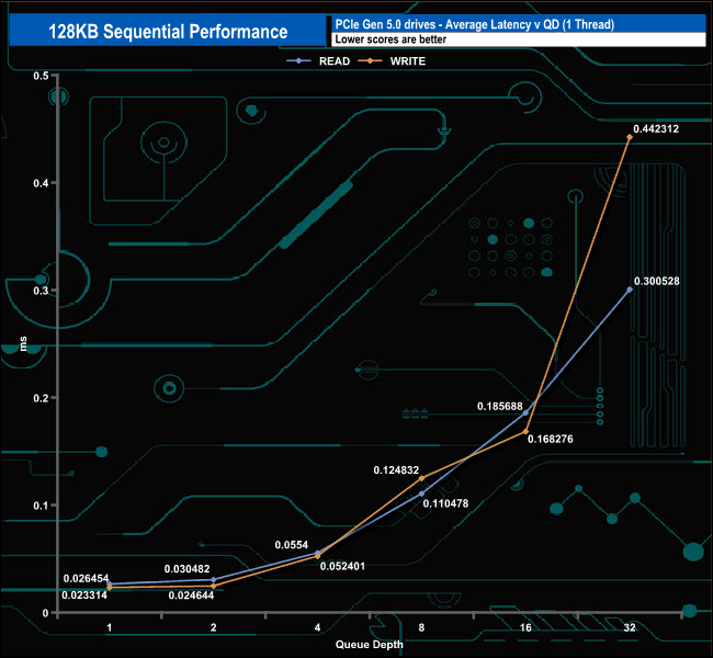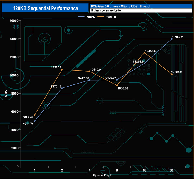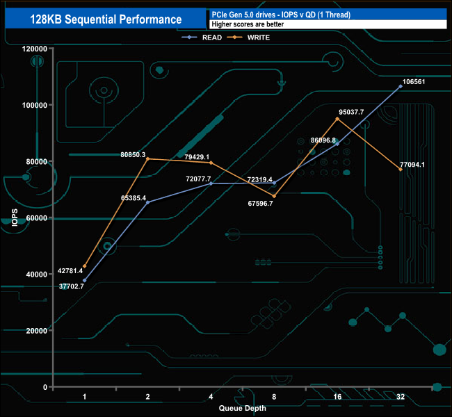 We used CrystalDiskMark 8‘s custom settings to test the Sequential read and write performance of the drive through a range of queue depths. The setup for the tests is listed below.