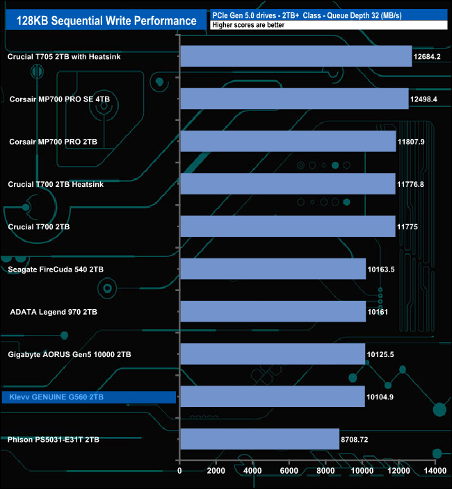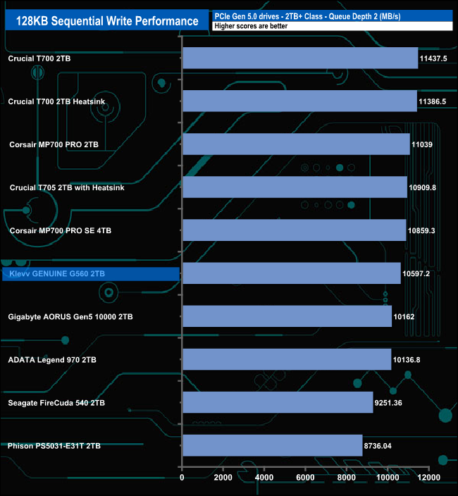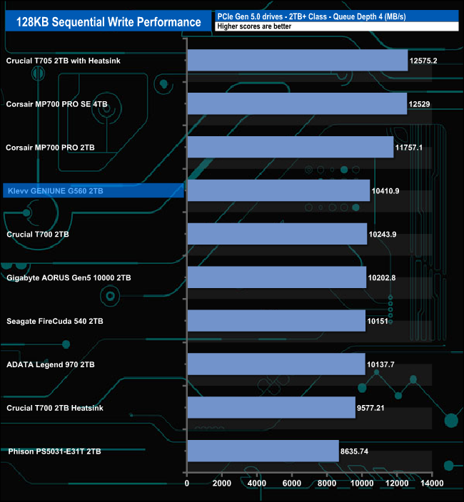 When it comes to the Sequential write test results the G560 seemed to perform best at QD4 where it sits fourth in the table. The worst performance comes at QD32 where it sits in penultimate place in the table. However, this is after it peaked at QD16 where it produced a result of 12,458MB/s, bettering the official maximum figure for the drive.