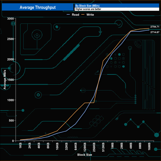 In our read throughput test, the drive peaked at the end of the test run (16MB block) at 2,714.67MB/s, well short of the official maximum of 4,000MB/s. Writes peaked at the same area as reads at 2,754.71MB/s, again well short of the official 3,800MB/s maximum.