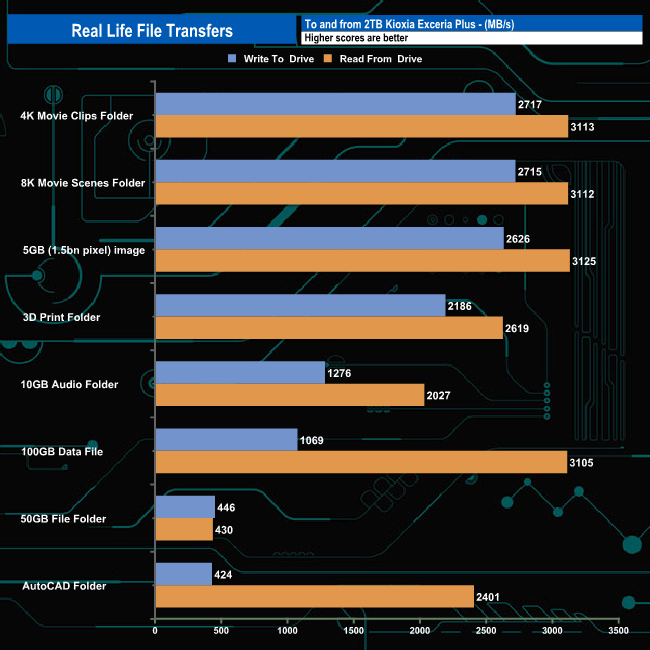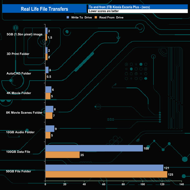 To test the real-life performance of a drive, we use a mix of folder/file types, and by using the FastCopy utility (which gives a time as well as MB/s result), we record the performance of the drive reading from & writing to a 2TB Seagate FireCuda 510.