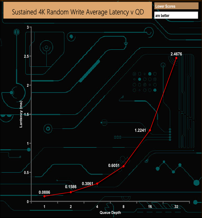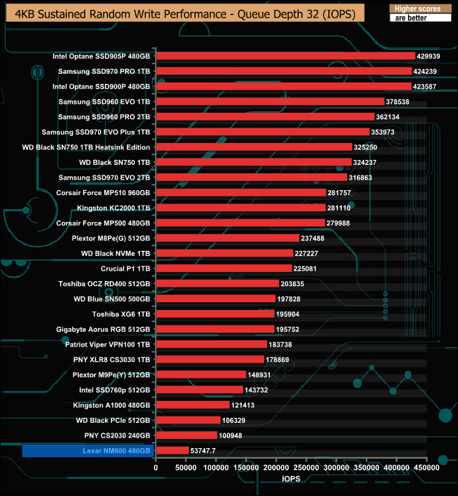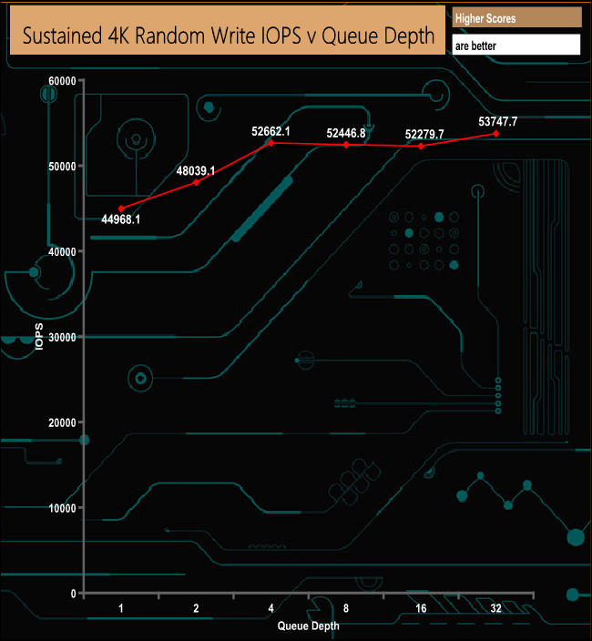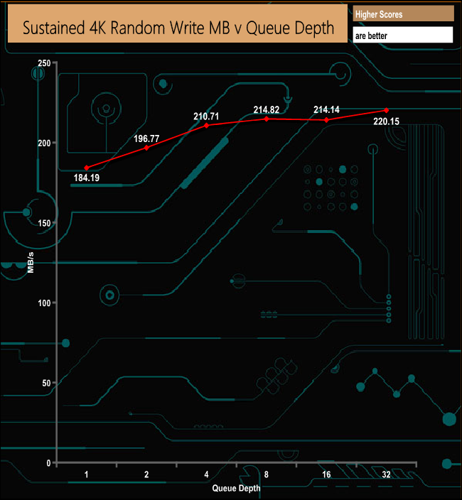 The official 4K random write rating for the NM600 480GB drive is up to 156,000 IOPS. As you can see from the results graph at 53,747 IOPS (QD32) we couldn't get anywhere close to that figure with our 4 thread tests. As with the random read tests, we did a quick test using eight threads at a QD of 32 which saw a dramatic rise in IOPS, with the drive reaching a maximum of 212,825.7 IOPS – far exceeding the official figure.