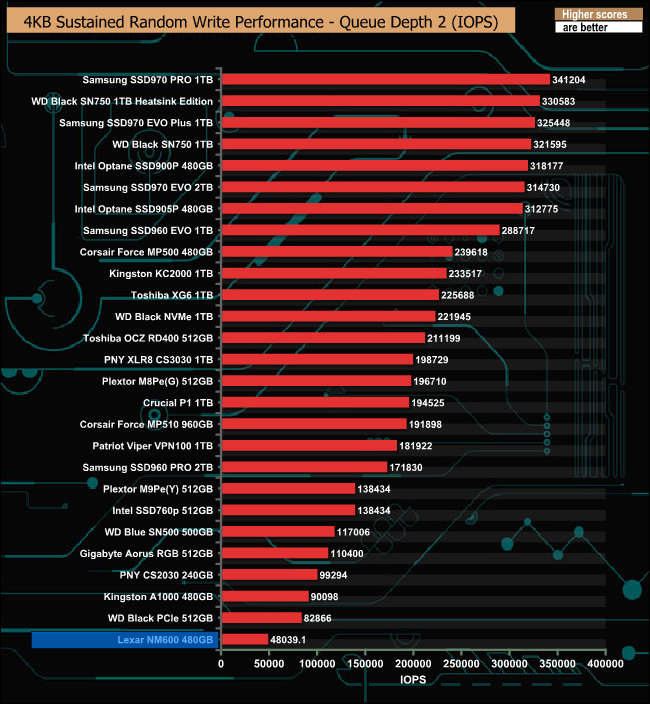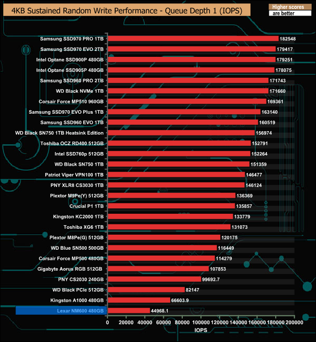 The NM600 has real problems with our 4K write tests, sitting at the bottom the of the chart throughout the tested queue depths.