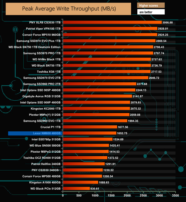 The 1,652.75MB/s write throughput score propels the drive further up the chart than the read score does.