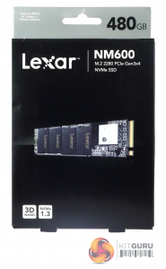 The front of the box has a large clear image of the drive on it along with notes about the fact it uses 3D NAND and supports the NVMe 1.3 specifications. The tab at the top of the box is labelled with the drive's capacity.