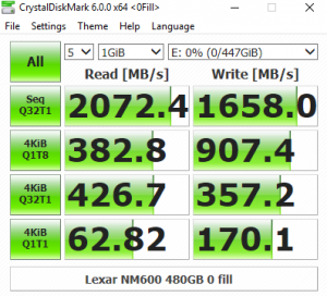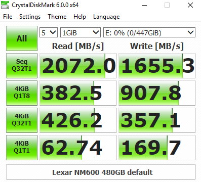 The Lexar NM600 doesn't perform well in the CrystalDiskMark benchmark at a deep queue depth of 32. Looking at the two benchmark result screens, the Silicon Motion controller doesn't seem to have a preference as to the type of data is asked to handle.