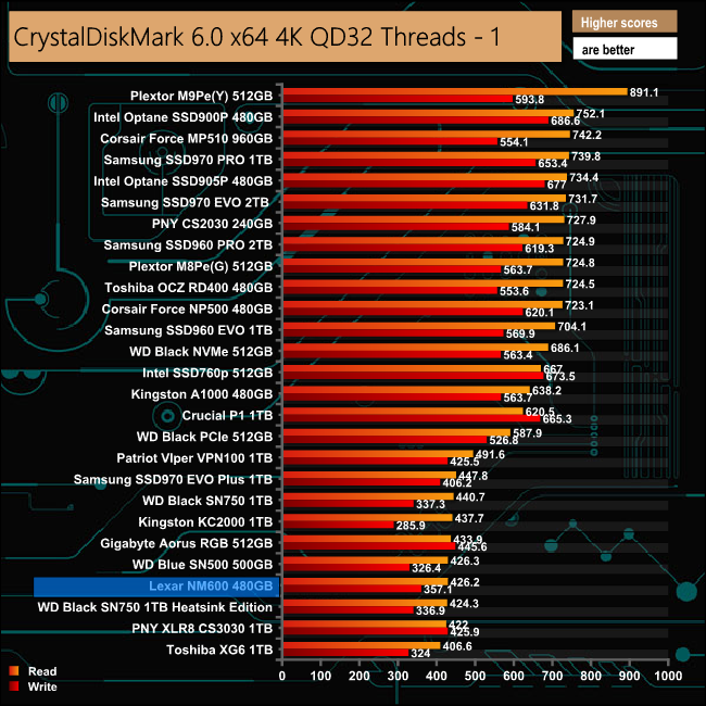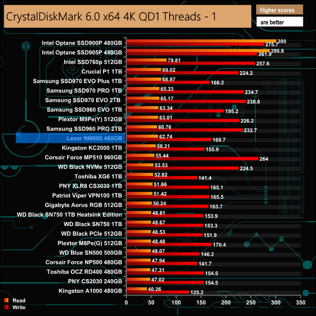 At a QD of 1, where most of today's desktop workloads take place, the NM600 seems to perform better, with a read score of 62.74MB/s with writes at 169.7MB/s.