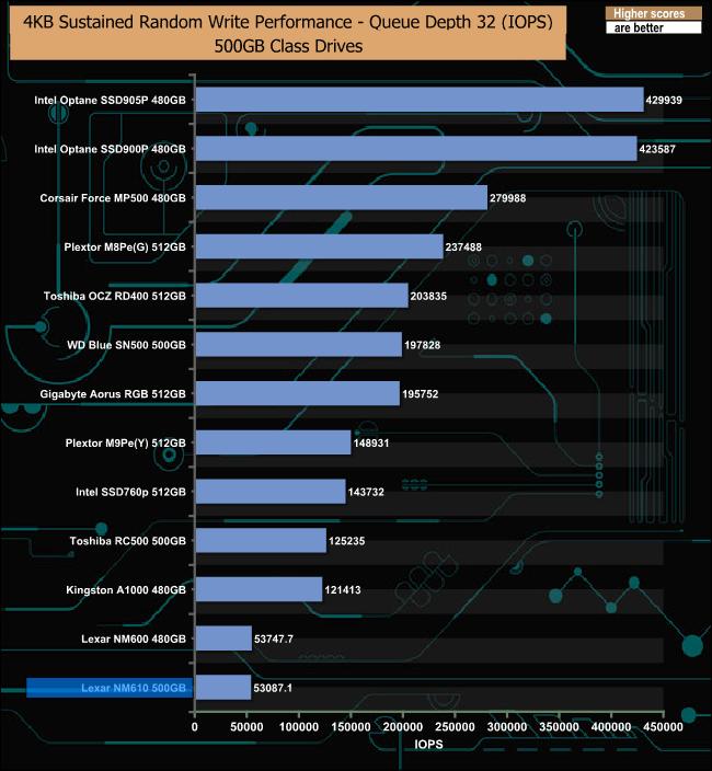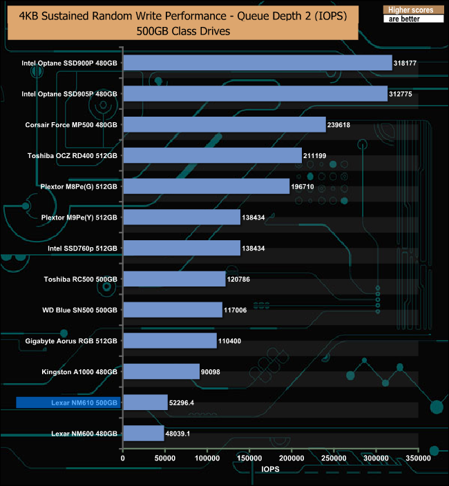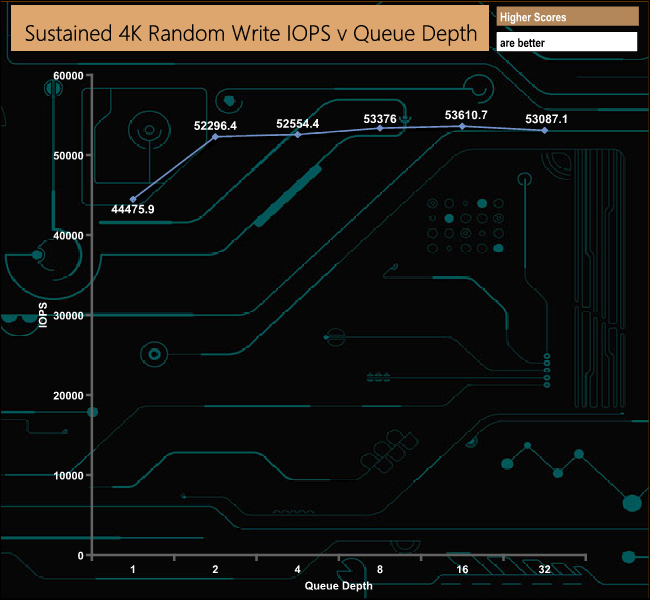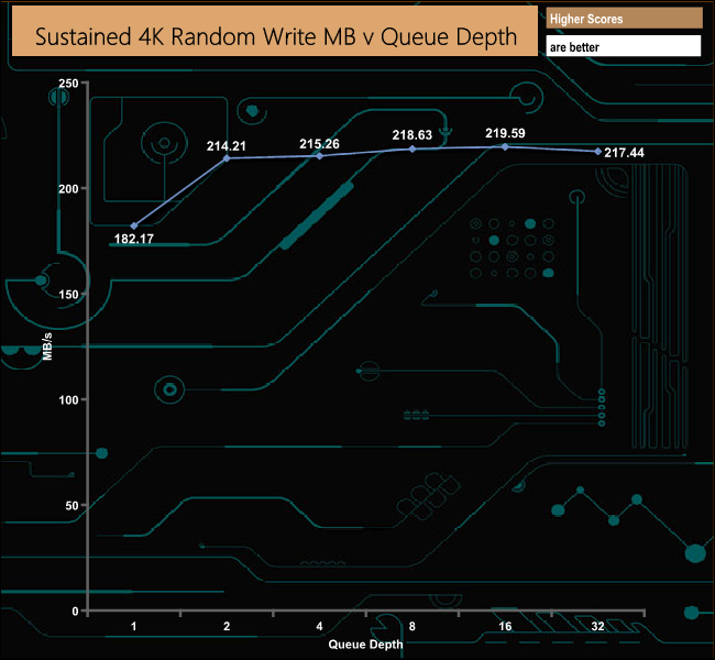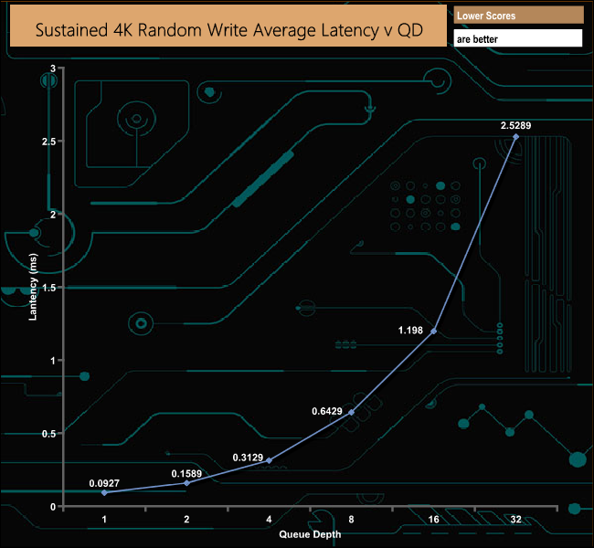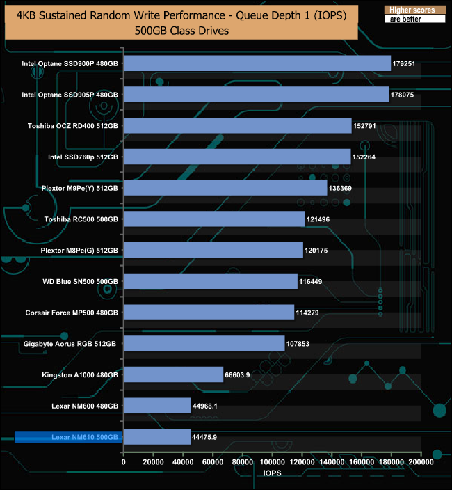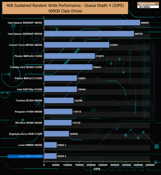 The official 4K random write rating for the NM610 500GB drive is up to 156,000 IOPS. As you can see from the results graph at 53,610 IOPS (QD16) we couldn’t get anywhere close to that figure with our 4 thread tests. As with the random read tests, we did a quick test using eight threads at a QD of 32 which saw a dramatic rise in IOPS, with the drive reaching a maximum of 230,445 IOPS – far exceeding the official figure.
