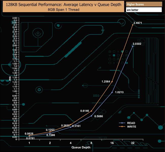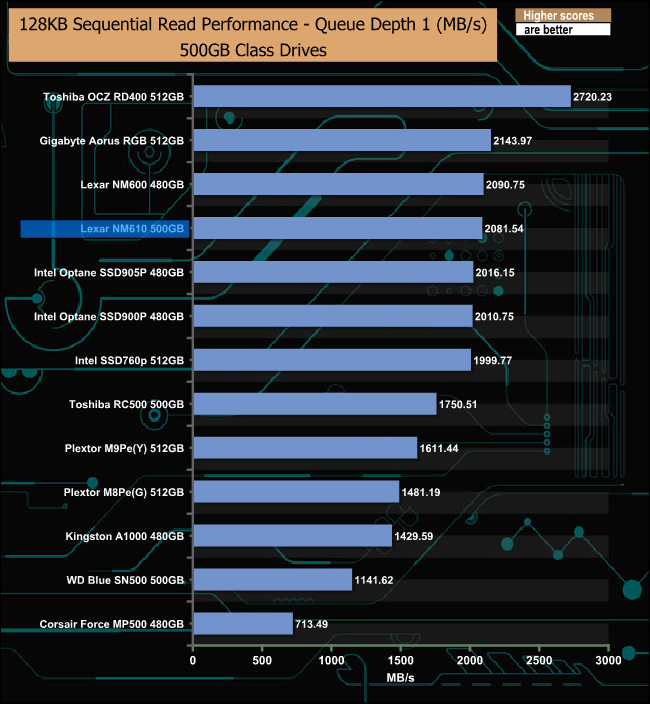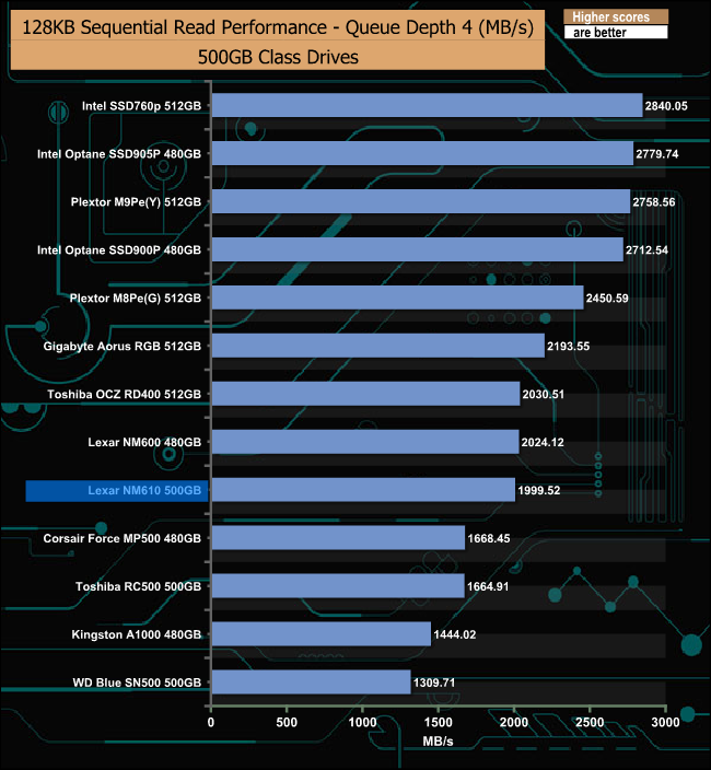 The NM610 and NM600 are pretty much tied together throughout our tested Queue Depths with the exception of QD4 when the NM610 suffers a small dip in performance.