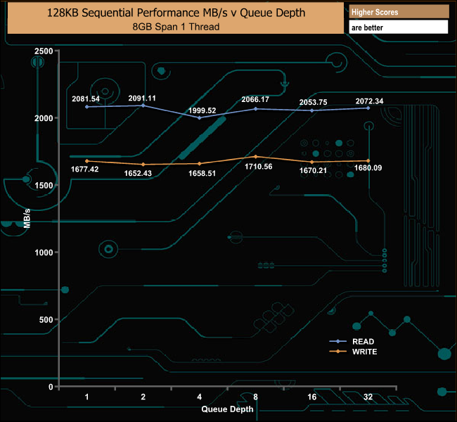With our Sequential read/write test we couldn’t quite match the official maximum read figure of 2,100MB/s at 2,091.11MB/s but we bettered the official write score of 1,600MB/s, the test runs producing a peak of 1,710.56MB/s at a QD of 8.