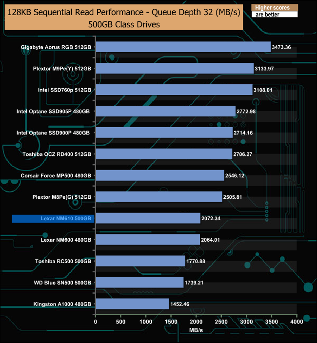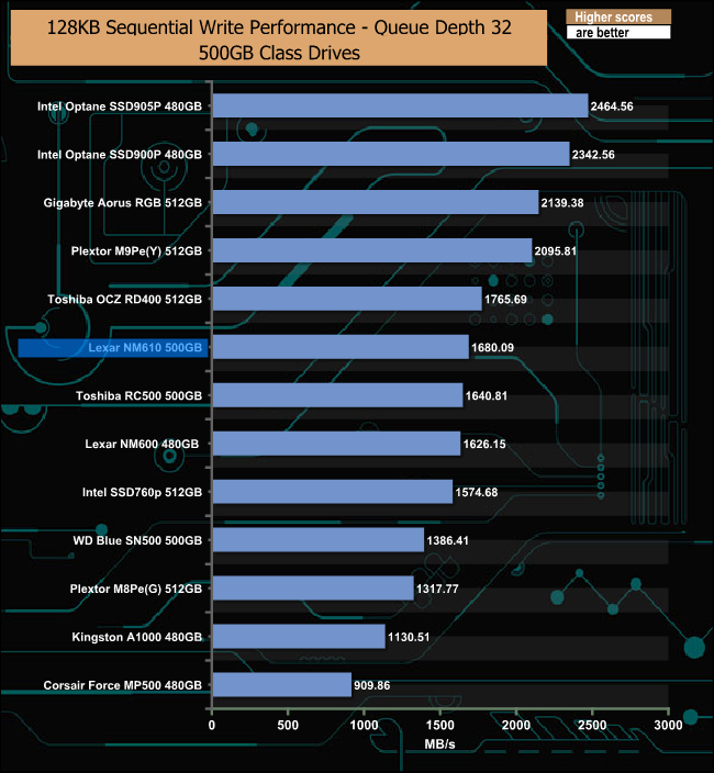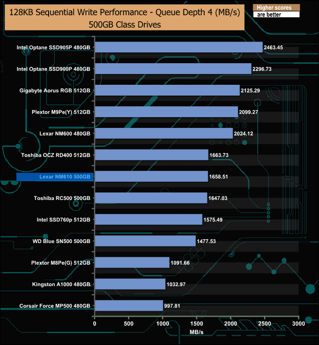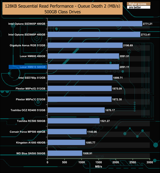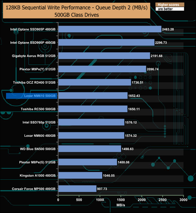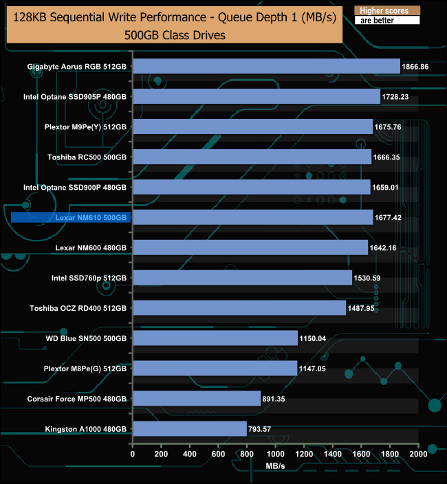 When it comes to our Sequential write tests, at a QD of 2 the NM610 shows a marked improvement in performance over the NM600 however, at a QD of 4 the roles are reversed with the NM600 having the advantage.