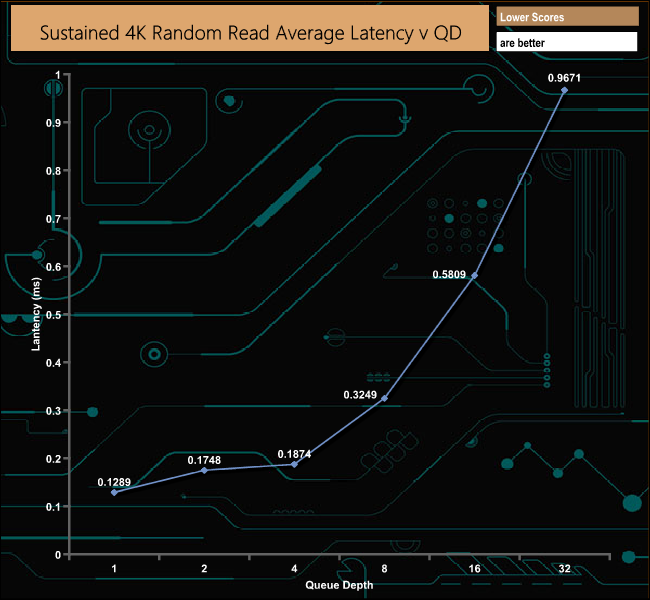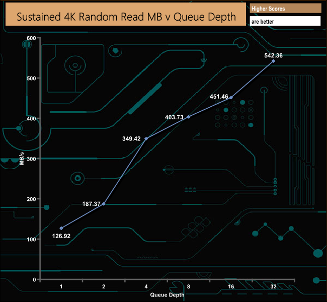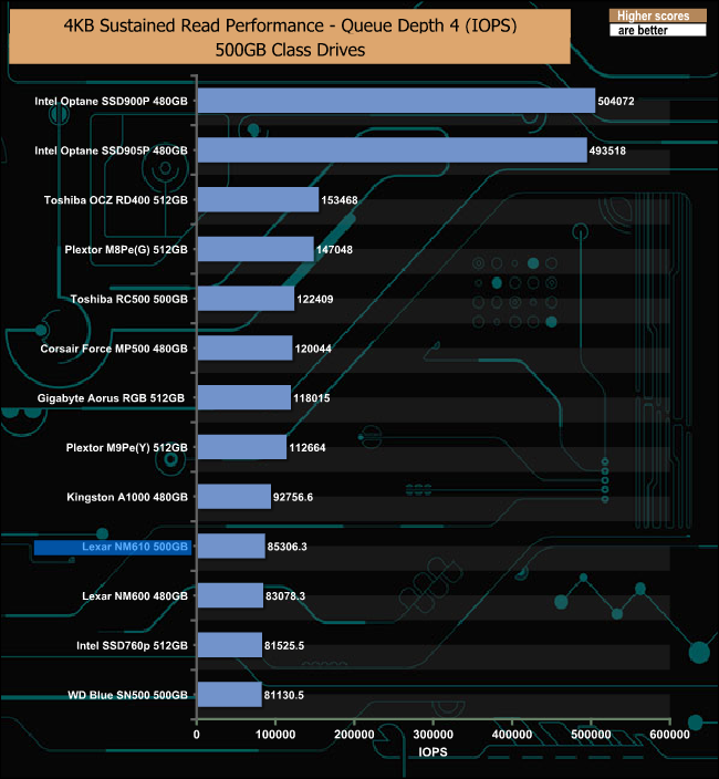 The NM610 drive performs a little better than the NM600 throughout the tested queue depths.