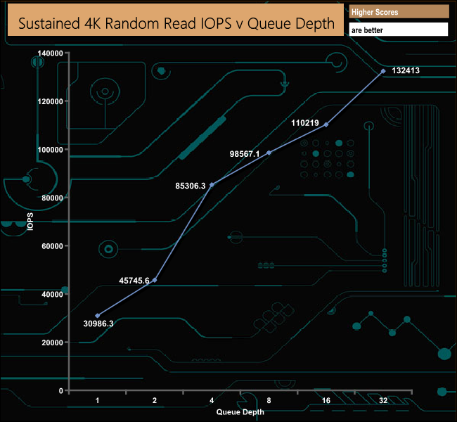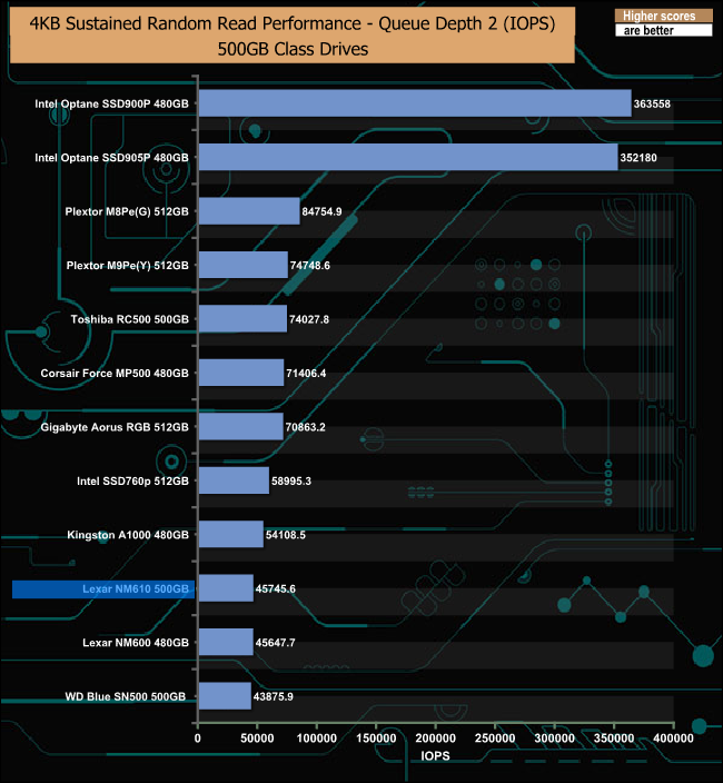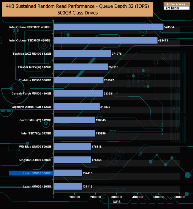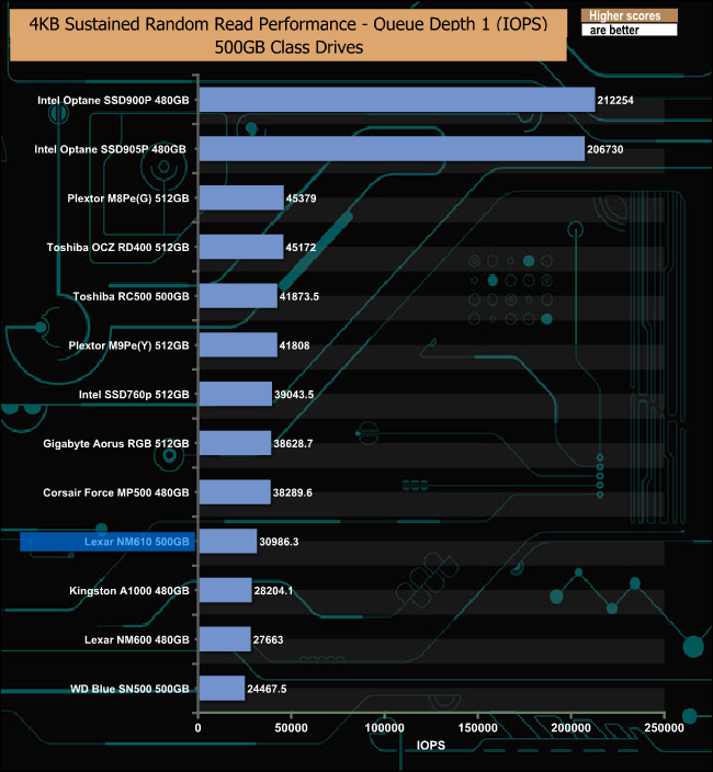 Lexar quote random 4K read performance for the 500GB NM610 as up to 188,000 IOPS. With our standard 4 thread testing, we couldn’t get close to that figure, the best we saw was 132,413 IOPS at a QD of 32. However, a quick test at QD32 with 8 threads saw the random read performance rise to 243,856 IOPS, surpassing the official figure.