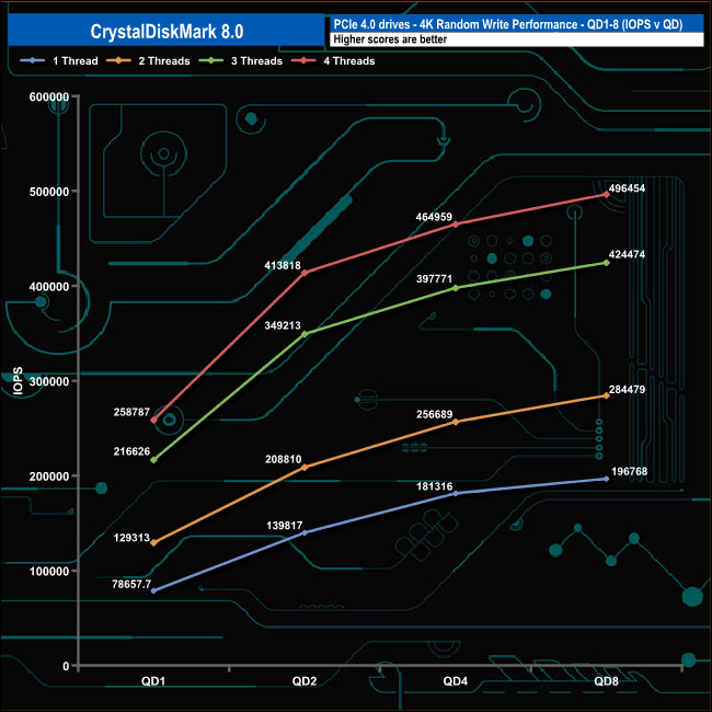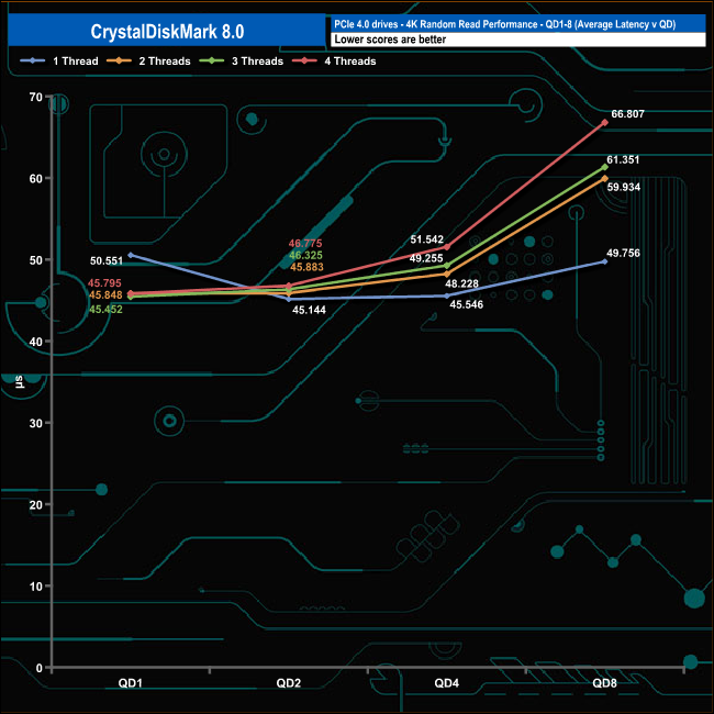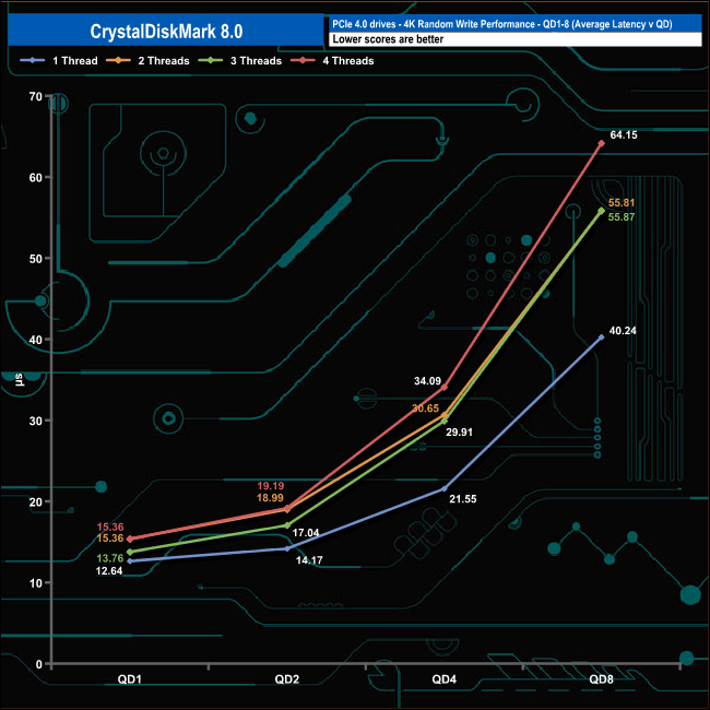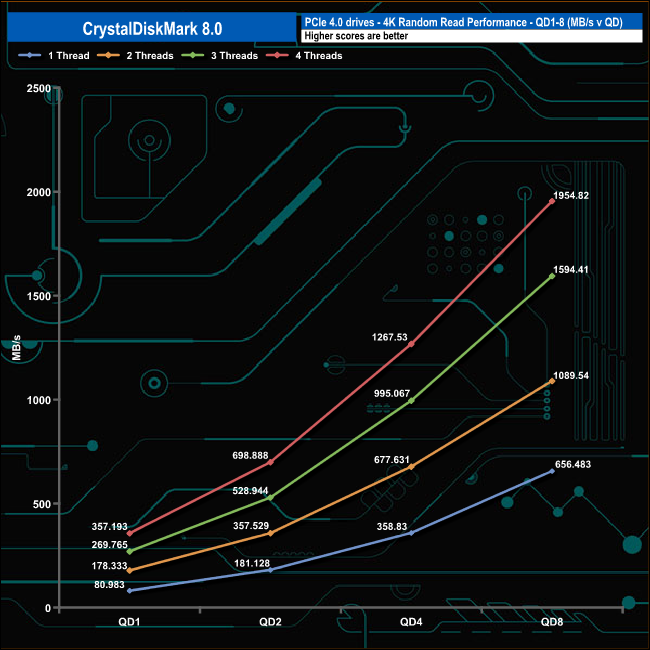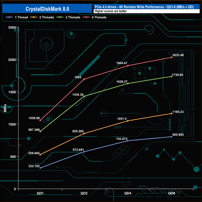 We used CrystalDiskMark 8 to test the random performance of the drive at lower queue depths (QD1 – QD8 where most of the everyday workloads occur) using 1 to 4 threads.
