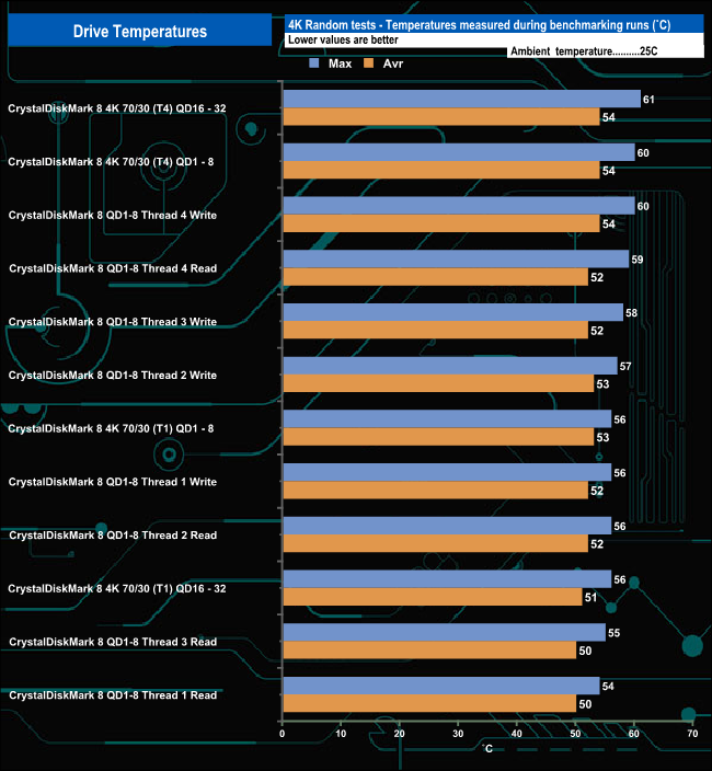 During our benchmarking runs, the hottest the drive got was 68° C during CrystalDiskMark 8 Sequential QD1-32 T1 Write test and the ATTO test, which is only 2°C away from the stated maximum operating temperature of 70°C, which is very close for comfort. But despite this, we didn't appear to see any throttle back during our tests. For the non-4 K tests the drive averaged 57°C while for the 4K-based tests, the average was 54.8°C.