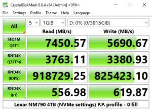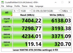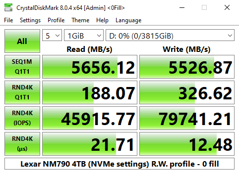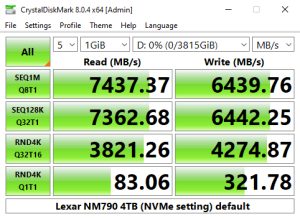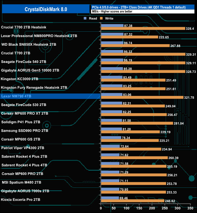 Using the CrystalDiskMark 4K QD1 1thread benchmark, the read score of 83.06MB/s for the Lexar NM790 is a little slower than the last Lexar drive we looked at, the heatsink version of the Professional NM800 Pro, but the write performance of the NM790 is significantly faster.